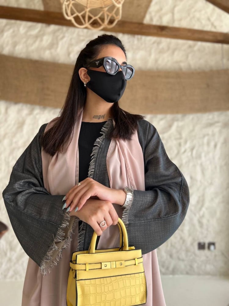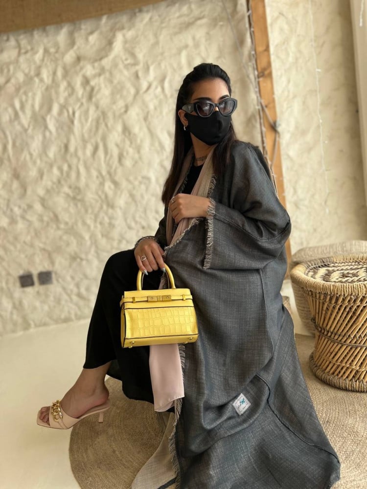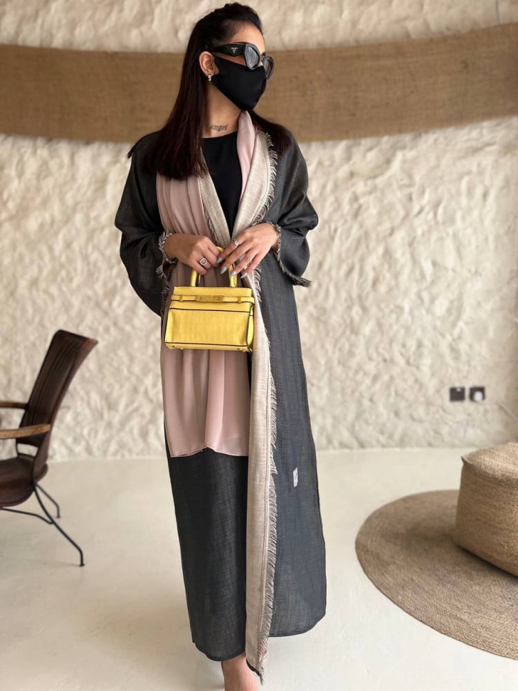 عباية ملونة بلون رمادي من خامة لنن الجنز الهندي الناعم. من العبايات التي تم تصميمها للمناسبات وان تكون عملية بنفس الوقت. موديل العباية كلاسيك.