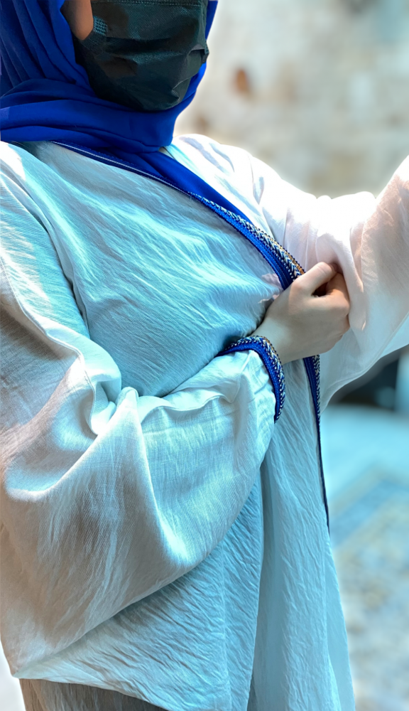 عباية بيضاء مطرزة بالازرق الجميل. عباية مناسبات من قماش لنن الخفيف بقصة بشت جميلة من العبايات الملونة والراقية.